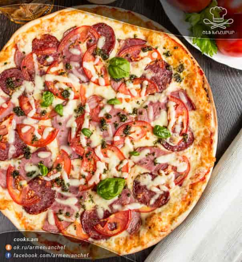 - Բացում ենք խմորը բարակ շերտով, դնում տապակի վրա, քսում սոուսի կեսը և ավելացնում քերիչով անցկացրած պանիրը (թողնում մի փոքր պամիր միջուկի վրա շաղ տալու համար): Շարում կտրատված խոզապուխտը, սալյամին և լոլիկը, ապա շաղ տալիս վրան մնացած պանիրը և թխում ջեռոցում 10 րոպե 300 աստիճանում: