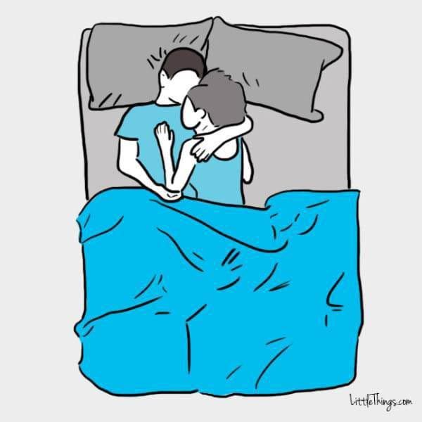 4. Երբ քնելուց առաջ զույգը գրկում է միմյանց, իսկ հետո հասկանում, որ այդպես այնքան էլ հարմար չէ քնել ու բաժանվում է։ Սա այն դեպքերից է, երբ հարաբերություններն արդեն հասուն ու կայացած են։ Նրանք սիրում են միմյանց, սակայն ցանկանում են հոգ տանել դիմացինի մասին ու թույլ տալ նրան խորը քուն մտնել։ Այդ պատճառով նրանք նախընտրում են մի փոքր հեռու, բայց խորը քնել։