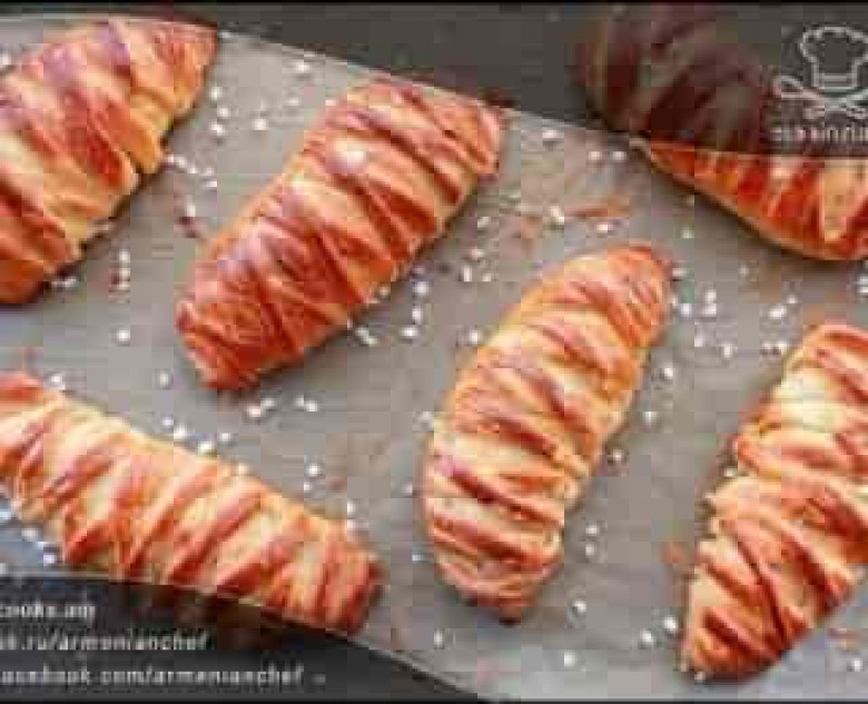 - Ապա բաժանում ենք խմորը 8 գնդի, գրտնակում յուրաքանչյուր գունդը, բացում բարակ շերտով, մեջտեղում դնում կաթնաշոռային կրեմը, վրան շարում կտրատված դեղձը և ծալում ենք խմորի մի ծայրը:
