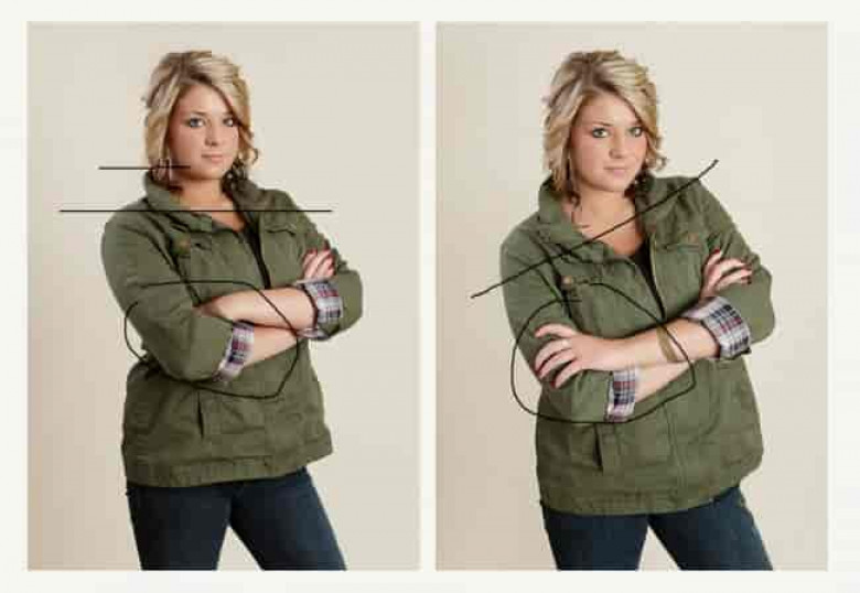 Իջեցված ուսը երկարեցնում է վիզը, դեմքը ավելի բաց է դարձնում։ Նաև պետք է փորձել խուսափել թաքցրված ձեռքերից։ Երկրորդ նկարի վրա ձեռքը արմունկի վրա է, և չի թաքնվում։