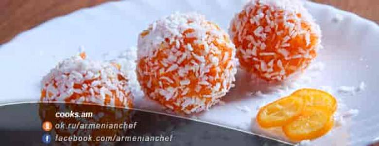 - Պատրաստի զանգվածը խառնում ենք և պատրաստում փոքրիկ գնդիկներ: Ստացված գնդիկները թաթախում ենք մնացած կոկոսի քերուկի մեջ և տեղափոխում սառնարան 1,5 ժամով: