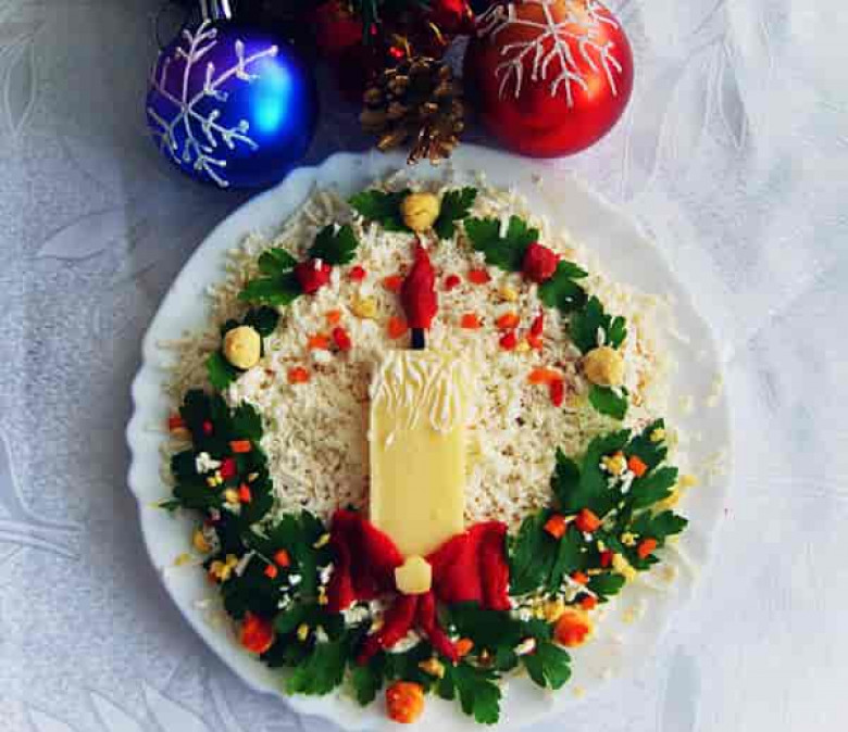 Աղցան Ձմեռ պապ: Բաղադրատոմսը՝ ցանկացած տեսակի աղցան՝ վրան քերած պանիր, ձու, ձիթապտուղ, տոմատի մածուկ: