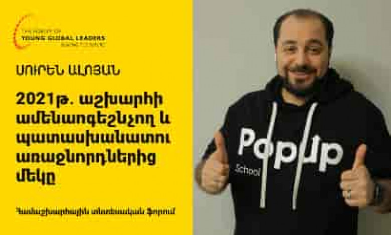 ОбществоВсемирный экономический форум (ВЭФ) удостоил всемирного признания генерального директора и основателя образовательной платформы DASARAN Сурена Алояна за его уникальный профессиональный и общественный вклад. Форум чествовал Сурена Алояна как Mолодого глобального лидера 2021 года. Сурен Алоян - первый гражданин Армении, удостоенный этого титула ВЭФ. Как молодой лидер ВЭФ Сурен Алоян будет представлять Армению в сообществе всемирно известных молодых лидеров. Всемирный экономический форум — это платформа, объединяющая более 1400 выпускников из 120 стран. К платформе по-прежнему присоединяются новаторы в сфере гражданского бизнеса, предприниматели, технологические лидеры, преподаватели, активисты, художники, журналисты и другие.