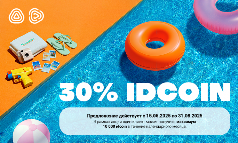 Каждому клиенту начисляется до 10 000 idcoin-ов в месяц, так что весь сезон вы сможете радовать себя бонусами и пользоваться 30% мгновенного idcoin-а снова и снова. Так что у вас ещё будет время насладиться любимыми бассейнами и накопить idcoin — как в июле, так и в августе.