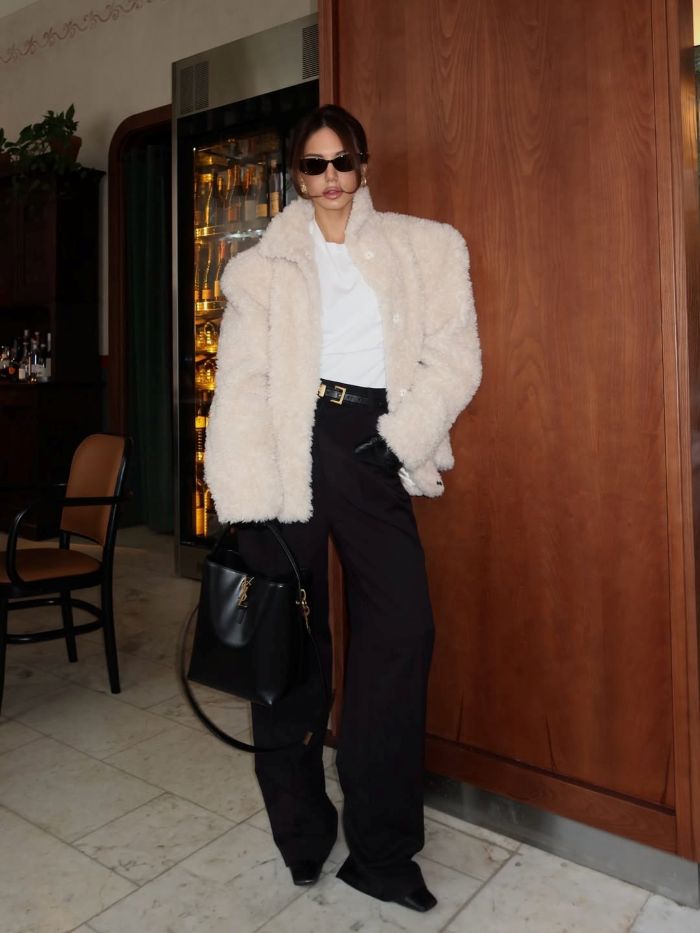 Образ Анушик Оганян - это про современную интерпретацию классики без ощущения «официальности». Белая блузка и чёрные брюки - максимально чистая база, которая сегодня снова в центре внимания. Меховая шуба Snezhana Morgan добавляет объёма и глубины, а сумка Saint Laurent Le 37 и кожаные перчатки переводят образ в актуальный городской контекст.
