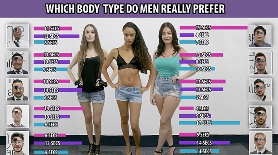 Собрали 10 добровольцев и вооружили их глаза устройством слежения, чтобы эксперимент получился беспристрастным, а на слова молодых мужчин исследователи не полагались – и правильно делали, все для того, чтобы узнать, нравится ли им пышные, спортивные или тоненькие женщины ... так, кто получил наибольшее внимание?