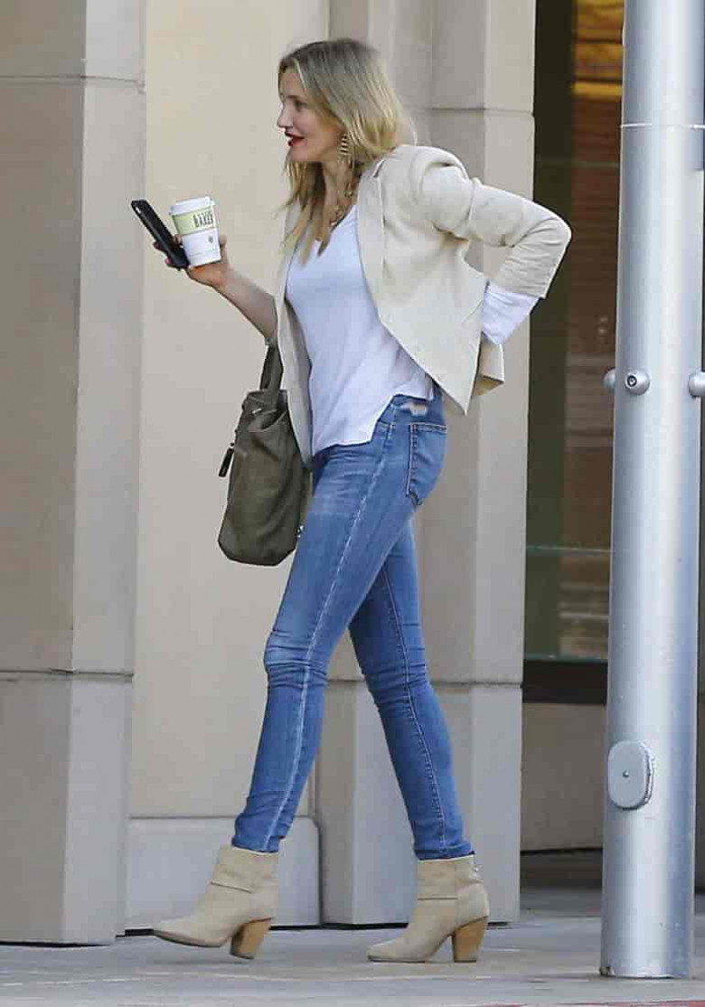 Для бизнес-ланча Диаз выбрала облегающие джинсы, белый топ свободного кроя и блейзер в стиле casual. Она пребывала в прекрасном настроении и приветливо улыбалась фотографам. С чем связаны такие перемены в Камерон, можно только догадываться. Возможно, все дело в возвращении звезды Голливуда к работе — недавно она закончила съемки в фильме «Агент: Век 21-й», а уже через несколько недель приедет на съемочную площадку картины «Бобби Сью».
