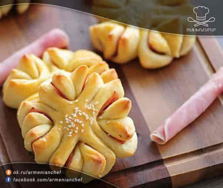 - Պատրաստի ծաղիկների վրա հարված դեղնուց քսել, մեջտեղի մասում քունջութ շաղ տալ, ապա տեղադրել ջեռոց և թխել 15-20րոպե 180աստիճանում:
