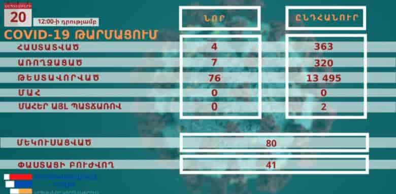 Առայսօր, COVID-19-ը ախտորոշվել է 363 մարդու մոտ, որից 320-ը հաղթահարել է հիվանդությունը: Փաստացի բուժում է ստանում 41, ընդհանուր մեկուսացված է 80 քաղաքացի: