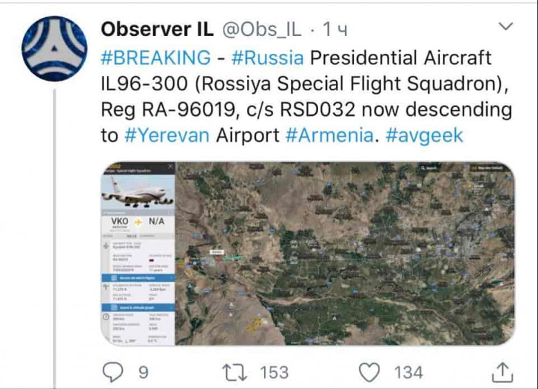 Ուշադրության կենտրոնումԱշխարհում տարբեր օդանավակայանների տեղաշարժը ֆիքսող Flightradar24 հավելվածը ֆիքսել է «Россия» ստորաբաժանմանը պատկանող Ил-96 օդանավի վայրէջքը Երևանում: Այս մասին գրում է BBC-ն: