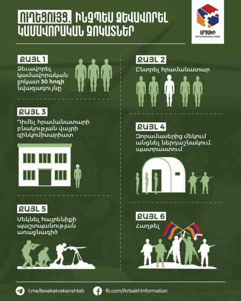 ՀասարակությունԱրցախի տեղեկատվական շտաբը հրապարակել է ինֆոգրաֆիկա, որում ներկայացված են այն քայլերը, որոնք անհրաժեշտ է կատարել կամավորական ջոկատներ կազմելու համար: Ըստ այնմ անհրաժեշտ է.