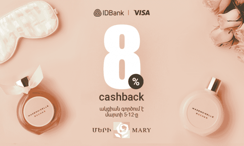 ՀասարակությունԿանանց տոների առթիվ մարտի 5-ից 12-ը ներառյալ «Մերի» օծանելիքի խանութ-սրահների ցանցից գնումներ կատարելիս վճարե՛ք IDBank-ի Visa քարտերովև ստացե՛ք 8% քեշբեք` գումարի վերադարձ։