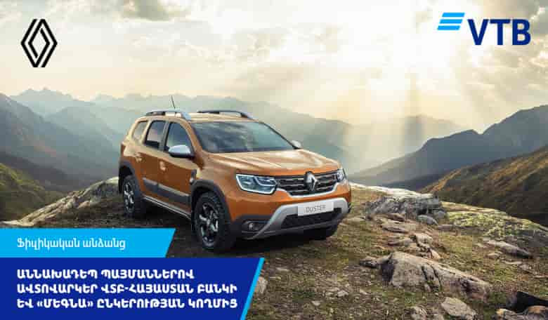 Ուշադրության կենտրոնումՎՏԲ-Հայաստան Բանկը և «ՄԵԳՆԱ» ՍՊԸ-ն համատեղ հաճախորդներին են առաջարկում ձեռք բերել Renault մակնիշի ավտոմեքենաներ՝ վարկավորման աննախադեպ շահավետ պայմաններով: