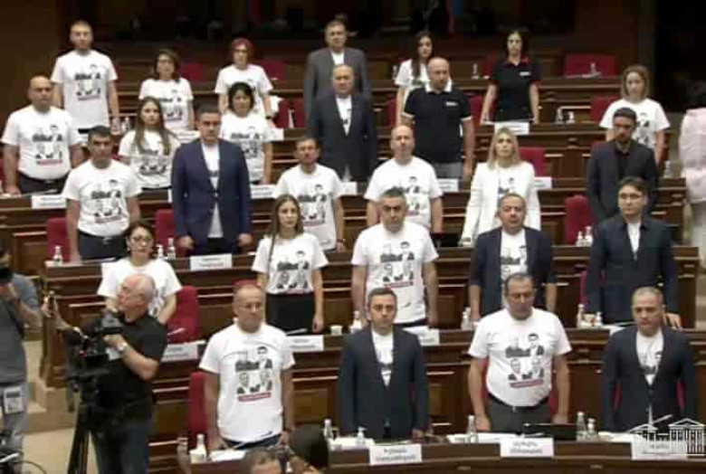 «Հայաստան» խմբակցությունն 8-րդ գումարման ԱԺ նիստին ներկայացել է Սյունիքի քաղբանտարկյալ քաղաքապետերի նկարներով շապիկներով