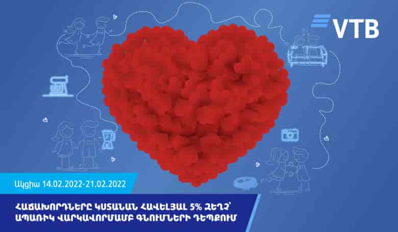 Ուշադրության կենտրոնումՄինչև փետրվարի 21-ը ՎՏԲ-Հայաստան Բանկի գործընկեր կազմակերպությունների վաճառակետերում ապառիկ վարկավորմամբ գնումներ կատարելու դեպքում հաճախորդները կստանան զեղչ: Զեղչը կկազմի վարկի գումարի 5%-ը: