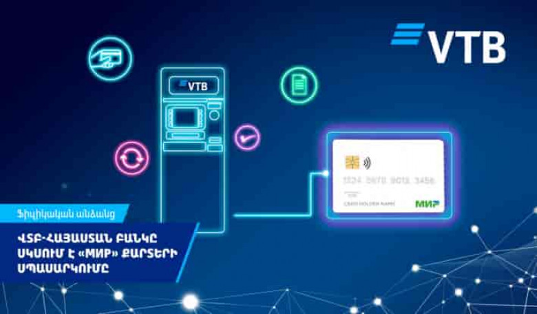 Ուշադրության կենտրոնում2022թ․ ապրիլից «Мир» վճարային համակարգի քարտապանները կարող են կանխիկացնել դրամական միջոցներ ՎՏԲ-Հայաստան Բանկի բանկոմատներից։ Ծառայությունը հասանելի է նաև ԱՊՀ երկրների գործընկեր վճարային համակարգերի քարտերի համար։