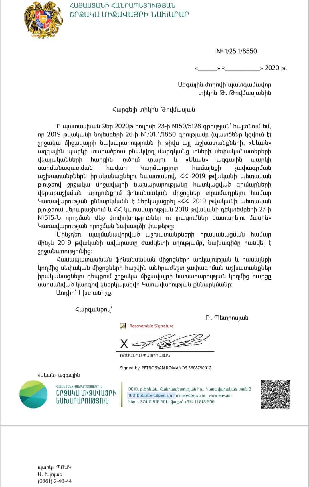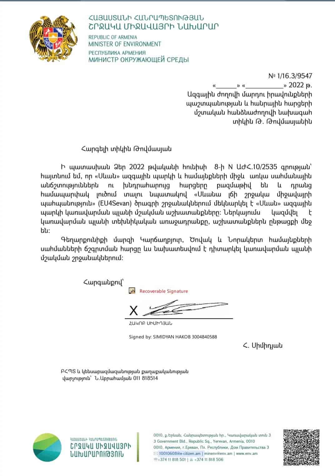 Ի պատասխան՝ նախարար Հակոբ Սիմիդյանը տեղեկացնում է, որ «Սևան» ազգային պարկի և համայնքների միջև առկա սահմանային անճշտություններն ու խնդրահարույց հարցերը բազմաթիվ են և դրանց համապարփակ լուծում տալու նպատակով «Սևանա լճի շրջակա միջավայրի պահպանություն» (EU4Sevan) ծրագրի շրջանակներում մեկնարկել է «Սևան» ազգային պարկի կառավարման պլանի մշակման աշխատանքները: Ներկայումս կազմվել է կառավարման պլանի տեխնիկական առաջադրանքը, աշխատանքներն ընթացքի մեջ են: Գեղարքունիքի մարզի Կարճաղբյուր, Ծովակ և Նորակերտ համայնքների սահմանների ճշգրտման հարցը ևս նախատեսվում է դիտարկել կառավարման պլանի մշակման շրջանակներում: