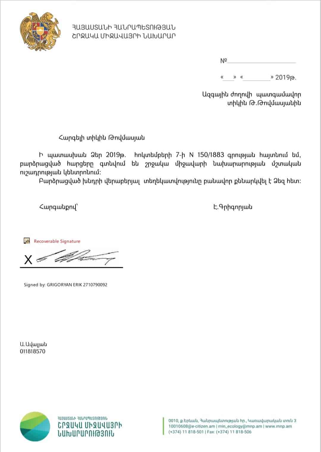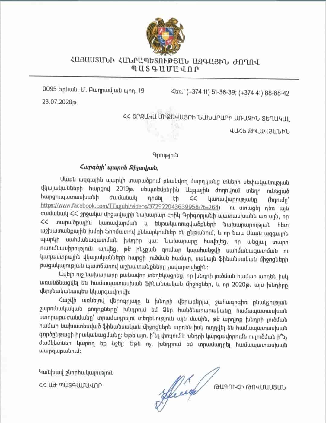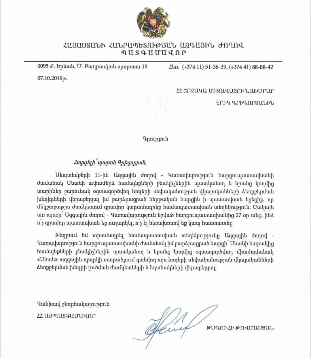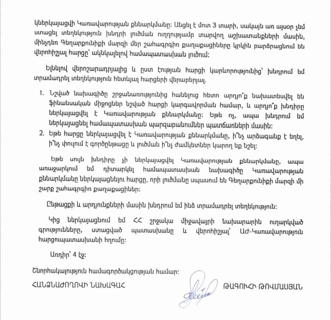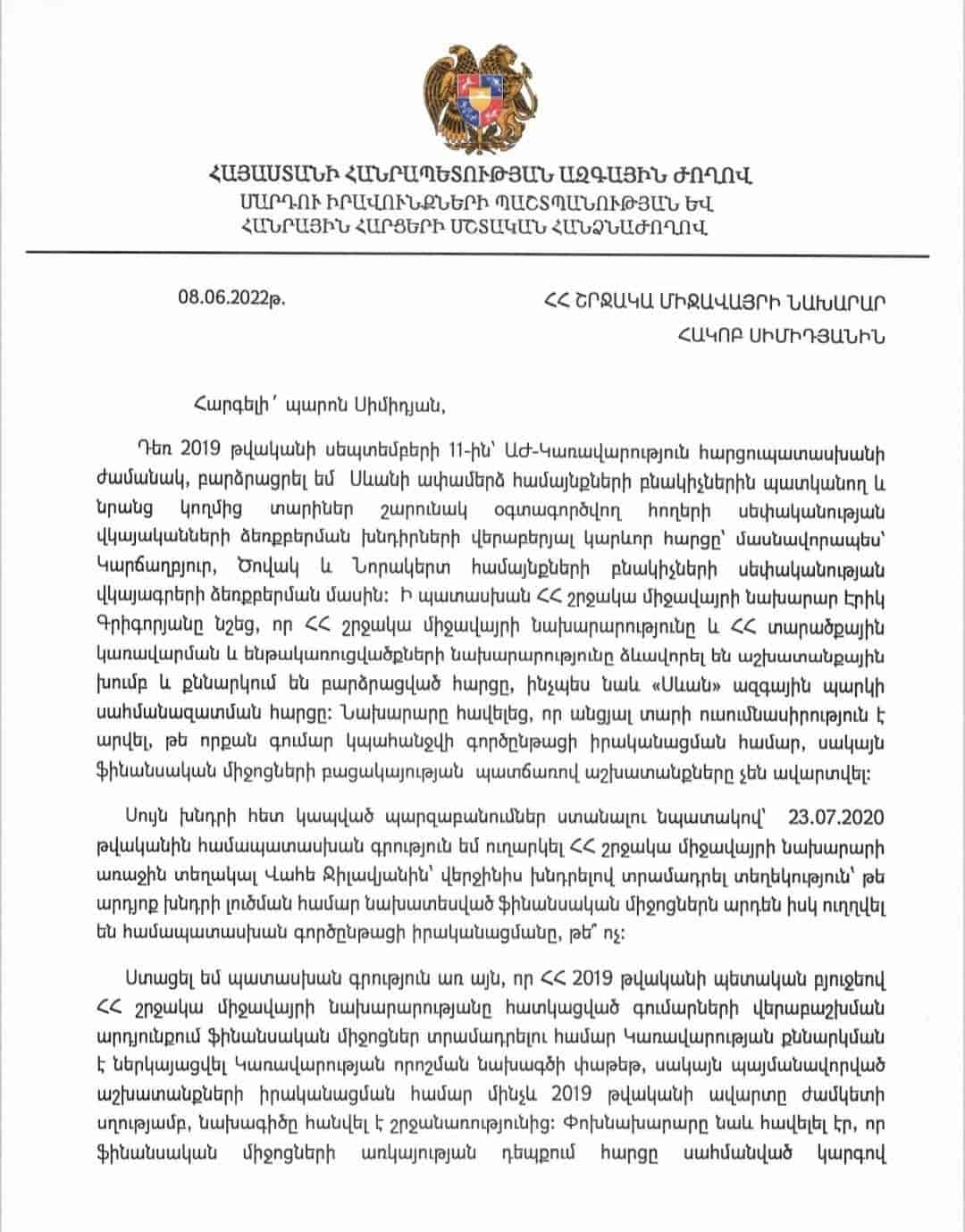 Գեղարքունիքի մարզից հերթական ահազանգից տեղեկացա, որ մարդիկ վրդովված են, պահանջում են Կառավարությունից հրատապ լուծում։ Եվ օրերս կրկին պաշտոնական գրությամբ դիմեցի ՀՀ շրջակա միջավայրի նախարար Հակոբ Սիմիդյանին։ Ներկայացնելով այս ողջ գործընթացը՝ համապատասխան հարցեր ուղղեցի նախարարին՝ խնդրի լուծման ընթացքի վերաբերյալ։ Միաժամանակ առաջարկեցի դիտարկել համապատասխան նախագիծը Կառավարության քննարկմանը ներկայացնելու հարցը, որի լուծմանը տարիներ շարունակ սպասում են Գեղարքունիքի մարզի շահագրգիռ քաղաքացիները։