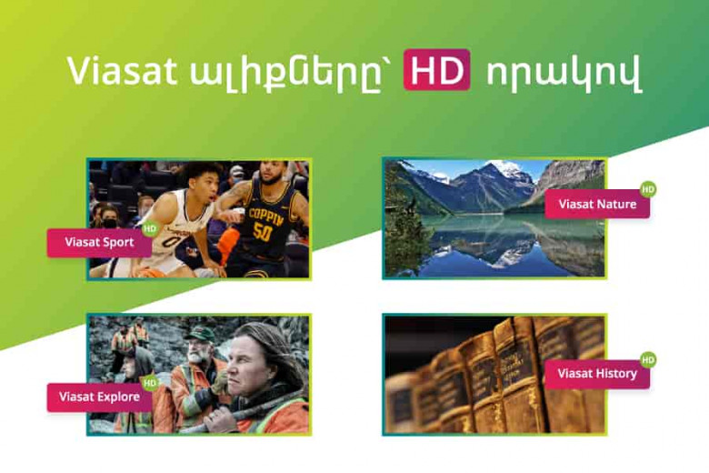 Viasat Sport հանրահայտ հեռուստաալիքը ցուցադրում է աշխարհի բասկետբոլի լիգայի՝ (NBA), գլխավոր բասկետբոլային լիգայի (MLB), հոկեյի, ամերիկյան ֆուտբոլի, բարձր դասի բոքսի առաջնություններ, էքստրեմալ սպորտաձևերի ու ավտոարշավների թողարկումներ: Viasat History հետ հեռուստադիտողները կբացահայտեն հնագույն և ժամանակակից քաղաքակրթության պատմությունը, կտեսնեն մեծագույն հայտնագործությունները, կիմանան տեխնիկայի և գիտության, սպորտի, երաժշտության, զինվորական կյանքի և գործարարության մասին: Viasat Nature-ն ընտանիքի բոլոր անդամների համար է և կտեղափոխի վտանգավոր գիշատիչների, անօգնական կաթնասունների, վայրի բնության աշխարհ: Viasat Explorer արկածային հեռուստաալիքը կհիացնի ճանապարհորդություններով, կենդանական աշխարհի բազմազանությամբ, արագաշարժ մեքենաներով, սպորտի էքստրեմալ տեսակներով և հայտնի հանցագործությունների բացահայտման պատմություններով: