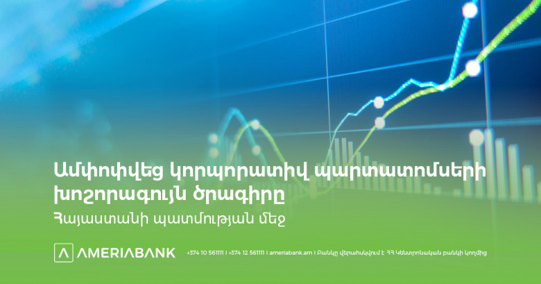 Հասարակություն2022 թվականի սեպտեմբերի 30-ին հաջողությամբ ավարտվեց Հայաստանի պատմության մեջ կորպորատիվ պարտատոմսերի ամենախոշոր գործարքը. ամբողջությամբ մարվեցին ՀՀ խոշորագույն հանքարդյունաբերական ընկերության՝ «Զանգեզուրի պղնձամոլիբդենային կոմբինատ» ՓԲԸ (ԶՊՄԿ) պարտատոմսերի անդրանիկ թողարկումները` 50 մլն ԱՄՆ դոլար և 2.5 մլրդ ՀՀ դրամ ծավալներով: Ամերիաբանկը հանդես էր եկել որպես ԶՊՄԿ պարտատոմսերի տեղաբաշխող և շուկա ստեղծող՝ այդպիսով հերթական անգամ կյանքի կոչելով ՀՀ տնտեսության, մասնավորապես` արժեթղթերի շուկայի զարգացմանն ուղղված քաղաքականությունը: