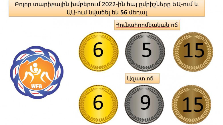 2022 թվականին հայ ըմբիշները՝ բոլոր տարիքային խմբերում, Եվրոպայի և Աշխարհի առաջնություններում կարողացել են 56 մեդալ նվաճել։