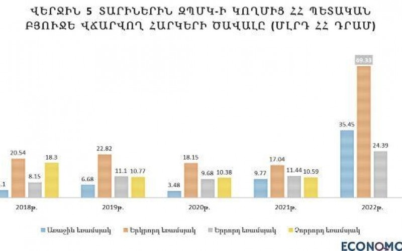 EconoMood-ը գծագրական ցուցակի տեսքով ներկայացուցած է վերջին 5 տարիներուն «Զանգեզուրի պղնձամոլիբդենային կոմբինատ»ի (ԶՊՄԿ) կողմէ ՀՀ պետական պիւտճէ վճարուած հարկերու ծաւալը: