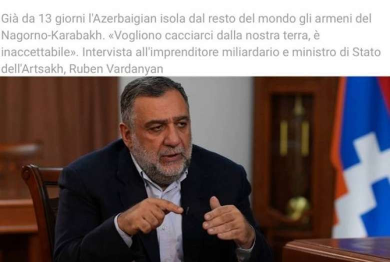 ՔաղաքականությունԱրցախի պետական նախարար Ռուբեն Վարդանյանը հարցազրույց է տվել իտալական հեղինակավոր TEMPI պարբերականին՝ ներկայացնելով ադրբեջանական շրջափակման հետևանքով Արցախում ստեղծված իրավիճակը: Ինչպես տեղեկացրին Արցախի պետական նախարարի աշխատակազմից, նա ընդգծել է, որ իրավիճակը բարդ է, սակայն արցախահայությունը մտադիր չէ հանձնվել և շարունակելու է պաշտպանել սեփական հողում ապրելու իր իրավունքը: