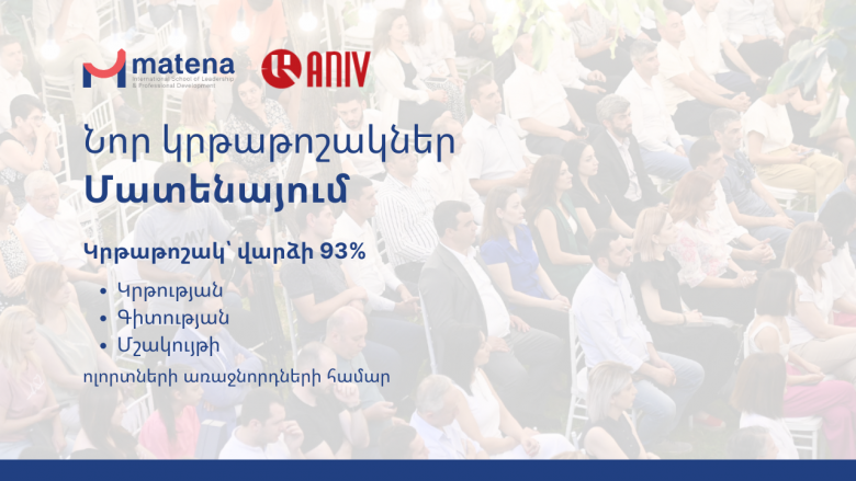 ՀասարակությունՀայագիտական հետազոտությունների զարգացման և աջակցության «Անիվ» հիմնադրամը սկսել է համագործակցությունը «Մատենա» միջազգային բիզնես դպրոցի հետ: Համագործակցության շրջանակում «Անիվ» հիմնադրամը կրթաթոշակներ կտրամադրի կրթության, գիտության և մշակույթի ոլորտի մասնագետներին: Այդպիսով, նշված ոլորտների մասնագետները կարող են մասնակցել «Մատենա»-ի ուսումնական ծրագրերին՝ վճարելով վարձի ընդամենը 7%-ը. 93%-ը կտրամադրի «Անիվ» հիմնադրամը՝ որպես կրթաթոշակ: