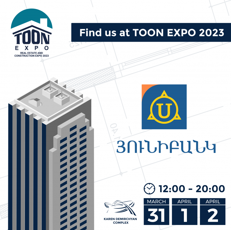 Ուշադրության կենտրոնումՅունիբանկը կմասնակցի «TOON EXPO 2023» անշարժ գույքի և շինարարության խոշորագույն միջազգային ցուցահանդեսին, որն անցկացվելու է 2023 թվականի մարտի 31-ից ապրիլի 2-ը Կարեն Դեմիրճյանի անվան Մարզահամերգային համալիրում։ Ցուցահանդեսը կգործի ժամը 12:00-20:00-ն: