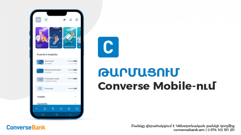 Ուշադրության կենտրոնումConverse Mobile-ի զարգացման ծրագրի շրջանակում Կոնվերս Բանկը ներկայացրել է նոր, թարմացված Հավելվածը՝ ավելի ֆունկցիոնալ ու գրավիչ ինտերֆեյսով: