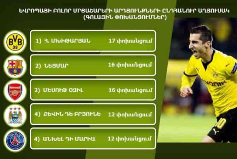 Ուշադրության կենտրոնումԴորտմունդի «Բորուսիա»-ի և Հայաստանի ֆուտբոլի ազգային հավաքականի հարձակվողական ոճի կիսապաշտպան Հենրիխ Մխիթարյանն իր կատարած 17 գոլային փոխանցումներով գլխավորում է Եվրոպայի բոլոր մրցաշարերի արդյունքների ընդհանուր աղյուսակը: