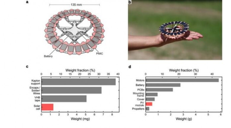 Ընդհանուր առմամբ, չորս էլեկտրական շարժիչով (և պտուտակներով) փոքր դրոնի վրա տեղադրվել են 24 առանձին մոդուլներ՝ յուրաքանչյուրը 1 սմ2 մակերեսով։ Դրանցից ստացված էներգիան բավարար է շարժիչներն աշխատացնելու ու դրոնն օդ բարձրացնելու համար։ Վահանակների արդյունավետությունը ռեկորդային արժեքներ չունի, այն 20 %-ից ոչ ավել է: Սակայն նրանց փոքր քաշն է դարձել կարևոր, բջիջներից յուրաքանչյուրը կշռում էր 1 մգ-ից մի փոքր քիչ, և դրանց մասնաբաժինը անօդաչու թռչող սարքի ընդհանուր քաշում զգալիորեն քիչ է 1 %-ից: Կան նաև էլեկտրոնիկա և մոնտաժային այլ նյութեր, որոնք ևս պետք է հաշվի առնել, բայց նույնիսկ այդ դեպքում էներգիայի ենթահամակարգի քաշը դրոնի քաշի 5 %-ից էլ ցածր է: