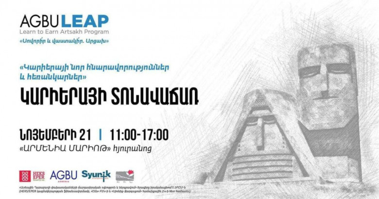 ՀասարակությունՆոյեմբերի 21-ին «Արմենիա Մարիոթ» հյուրանոցում կանցկացվի «Կարիերայի նոր հնարավորություններ և հեռանկարներ» խորագրով կարիերայի առաջին տոնավաճառը, որը կազմակերպվում է Հայկական բարեգործական ընդհանուր միության (ՀԲԸՄ) «Սովորի՛ր և վաստակի՛ր․ Արցախ» ծրագրի շրջանակում, Երևանի պետական համալսարանի և Եվրասիա միջազգային համալսարանի գործակցությամբ։