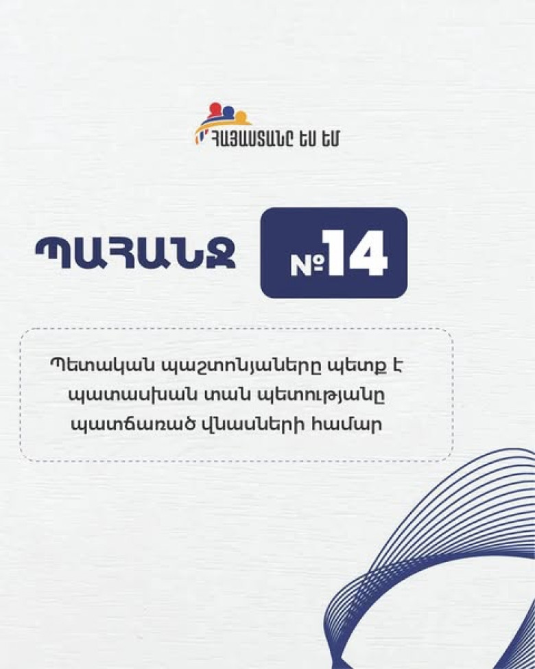 Պետական պաշտոնյաները պետք է պատասխան տան պետությանը պատճառած վնասների համար.«Հայաստանը ես եմ»-ի 14-րդ պահանջը