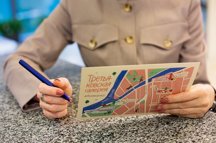 Հիշատակի բացիկը ստեղծվել է նկարազարդող Աննա Վասիլևայի կողմից, որը հայտնի է մանկական գրքերի և թատրոնի աֆիշաների համար իր աշխատանքներով, ինչպես նաև իր թեթև ու ինքնաբուխ նկարչական ոճով։ 2021թ․-ին նա ընդգրկվել է World Illustration Awards ամենահեղինակավոր միջազգային մրցանակի կարճ ցուցակում (shortlist)։ Հաշվի առնելով, որ Տրետյակովյան պատկերասրահը մայրաքաղաքում ունի շենքերի և մասնաճյուղերի բավականին ընդարձակ աշխարհագրություն՝ բացիկի սյուժեն ստացվել է ինքնին․ ցույց է տալիս նոր մասնաշենքի գտնվելու վայրը Մոսկվայի քարտեզի վրա՝ մնացած բոլոր մասնաճյուղերի նկատմամբ, իսկ ավելի կոնկրետ՝ Յակիմանկա թաղամասը, որտեղ կենտրոնացած է շենքերի մեծ մասը: Այսպիսով, նոր մասնաշենքում առաջին ցուցահանդեսի այցելուներին մնաց հուշանվեր՝ հիշեցնող ոչ միայն խորհրդանշական ցուցահանդես, այլև թանգարանի նոր մասնաշենք նրանց այցելության մասին, որի բացումը գրեթե 20 տարվա շինարարությունից հետո դարձավ պատմական իրադարձություն Ռուսաստանի մշակութային կյանքում.