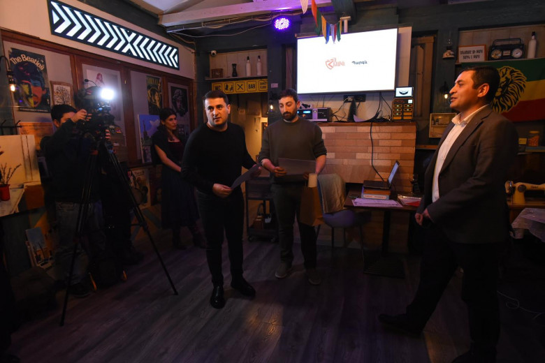 «Հայաքվեի» վարչության անդամ Մենուա Սողոմոնյանը մրցանակը հանձնել է հեռուստաընկերության համակարգող Նարեկ Սահակյանին։