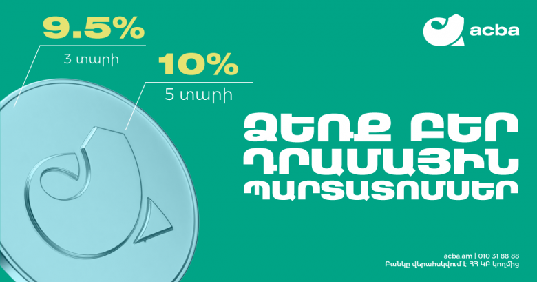 ՀասարակությունԱկբա բանկը, 2025 թվականի փետրվարի 20-ից մինչև 2025 թվականի ապրիլի 10-ը ներառյալ, հրապարակային առաջարկով մեկնարկում է արժեկտրոնային ոչ փաստաթղթային պարտատոմսերի միանգամից երկու տեղաբաշխում՝ համապատասխանաբար 3.000.000.000 (երեք միլիարդ) և 4.000.000.000 (չորս միլիարդ) ՀՀ դրամ ծավալով։