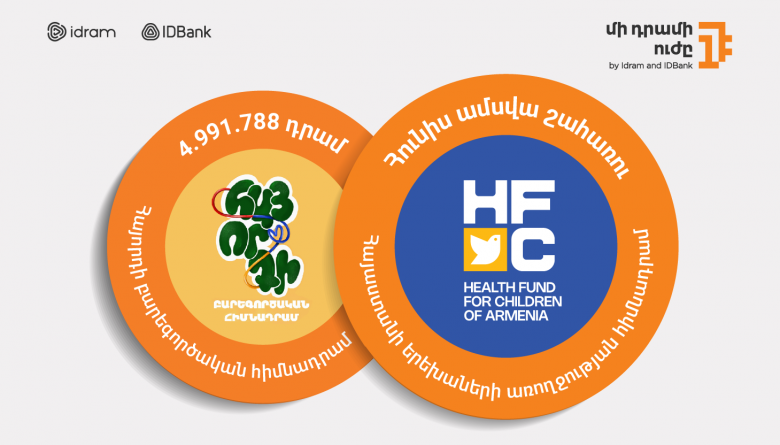 «Մի դրամի ուժի» բարի գործերին մասնակից դառնալու համար ընդամենը Ձեր բոլոր վճարումները կատարեք Idram&IDBank հավելվածով, IDBanking.am և banking.idram.am առցանց հարթակներով, Իդրամի և IDBank-ի տերմինալներով, և Ձեր յուրաքանչյուր վճարման դիմաց ընկերությունները մեկ դրամ կուղղեն կարևոր ծրագրերին։