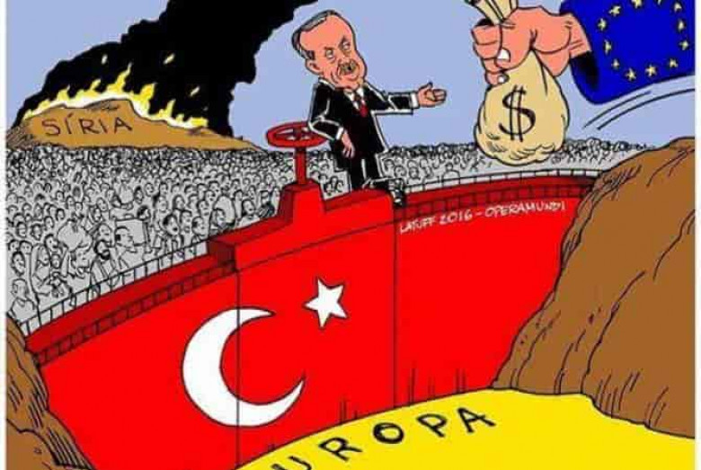 Նկարում երևում է, թե ինչպես է Թուրքիայի նախագահ Ռեջեփ Թայիփ Էրդողանը փակել սահմանն այրվող Սիրիայում կանգնած փախստականների առաջ ու նախ և առաջ ԵՄ-ից գումար է պահանջում: