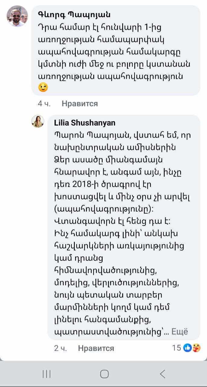 Գրառման տակ մեկնաբանությամբ արձագանքել է ՀՀ էկոնոմիկայի նախարար Գևորգ Պապոյանը։ Վերջինս հիշեցրել է կառավարության ծրագրերի մասին՝ նշելով. «Դրա համար էլ հունվարի 1-ից առողջության համապարփակ ապահովագրության համակարգը կմտնի ուժի մեջ ու բոլորը կստանան առողջության ապահովագրություն»։