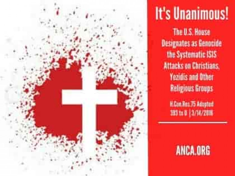 ՄիջազգայինԱՄՆ Կոնգրեսի Ներկայացուցիչների պալատը 393 կողմ եւ 0 դեմ ձայնով միաձայն դատապարտել է «Իսլամական պետության» կողմից Մերձավոր Արեւելքում քրիստոնյաների, այդ թվում՝ հայերի, ասորիների, ազգային փոքրամասնությունների՝ եզդիների եւ այլ կրոնական փոքրամասնությունների դեմ հանցագործությունները՝ դրանք ցեղասպանություն որակելով եւ ընդունելով համար 75 բանաձեւը։ Այս մասին հայտնում է ԱՄՆ հայ դատի հանձնախումբը։
