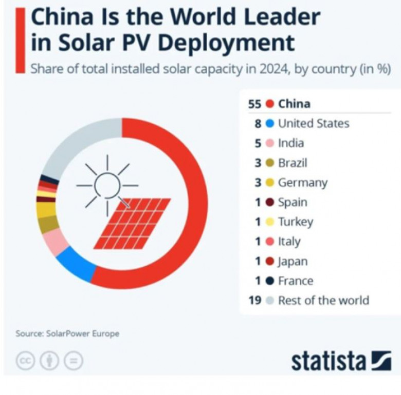 Carbon Brief-ի տվյալներով՝ Չինաստանը 2025 թվականին կտեղադրի ավելի շատ արևային էլեկտրակայաններ (գիգավատներով), քան արտահանել է։ Համաշխարհային տեղադրված արևային հզորությունը 2024 թվականին հասել է ռեկորդային 597 գիգավատի, նախորդ տարի ավելացված 148 գիգավատից հետո։ Այսպիսով, Ասիա-խաղաղօվկիանոսյան տարածաշրջանը պահպանել է իր առաջատար դիրքը՝ կազմելով համաշխարհային հզորությունների ավելացման 70%-ը։