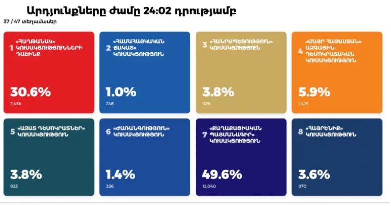 Հասարակություն«Պառլամենտարաիզմի զարգացման միջազգային կենտրոն» ՀԿ-ն հրապարակել է 37 տեղամասերից ստացված քվեները՝ ըստ մասնակից քաղաքական ուժերի։ Վերջին տեղամասերից ստացած քվեների հաշվին ՔՊ ձայները սկսկեցին նվազել՝ իջնելով 50 տոկոսի շեմից։