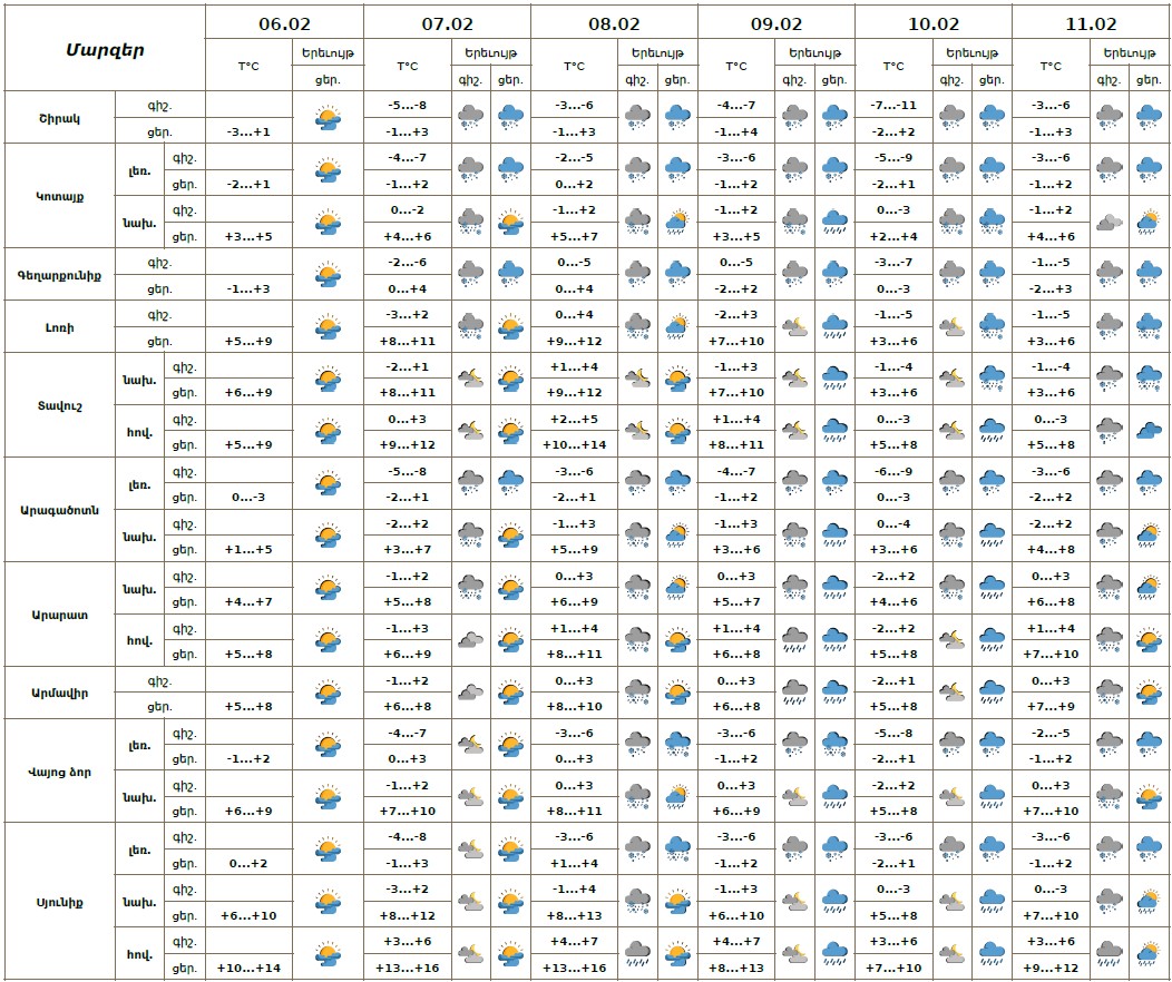 Փետրվարի 6-ի ցերեկը սպավում է առանց տեղումների եղանակ։ Փետրվարի 7-11-ին առանձին շրջաններում սպասվում են տեղումներ, նախալեռնային և հովտային շրջաններում՝ ձնախառն անձրևի և անձրևի, լեռնային շրջաններում ձյան տեսքով, լեռնային առանձին շրջաններում սպասվում է բուք, ցածր հորիզոնական տեսանելիություն։