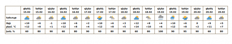 Օդի ջերմաստիճանը փետրվարի 15-ի ցերեկը, 16-18-ին ողջ հանրապետությունում աստիճանաբար կբարձրանա ևս 2-4 աստիճանով։