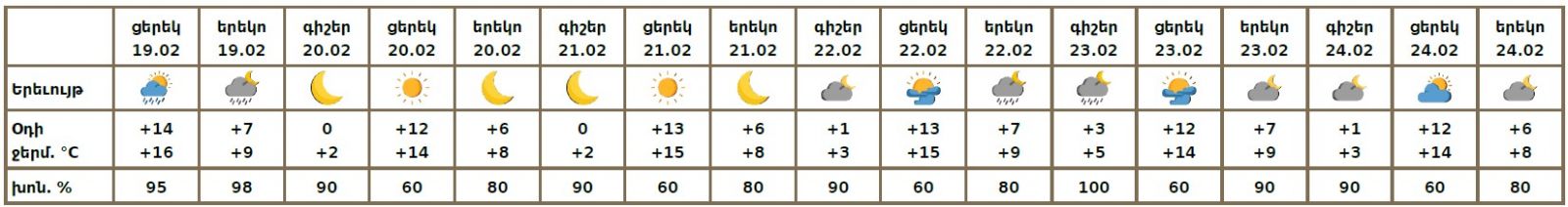 Փետրվարի 19-ի ցերեկը, 22-ի երեկոյան, 23-ի գիշերը սպասվում է կարճատև անձրև։ Փետրվարի 20-21-ին, 22-ի գիշերը, 23-ի ցերեկը, 24-ին սպասվում է առանց տեղումների եղանակ։