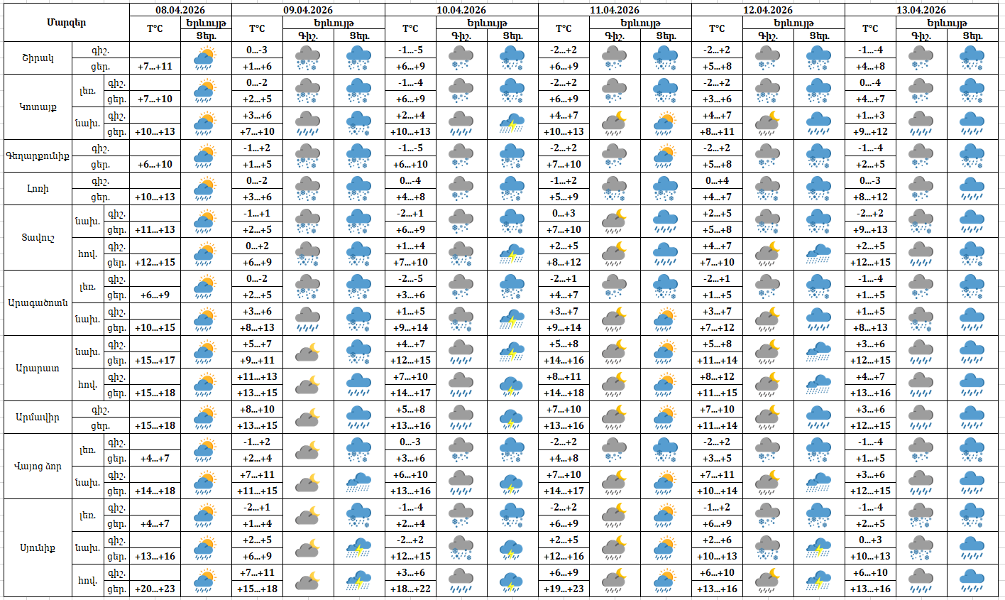 Ապրիլի 8-ի ցերեկը առանձին շրջաններում սպասվում են կարճատև տեղումներ։ Ապրիլի 9-13-ին ժամանակ առ ժամանակ շրջանների զգալի մասում սպասվում են տեղումներ, լեռնային և առանձին նախալեռնային գոտիներում ապրիլի 9-10-ին, 12-13-ին ձյան և թաց ձյան, հովտային գոտիներում՝ անձրևի տեսքով։ Առանձին վայրերում սպասվում է ամպրոպ։