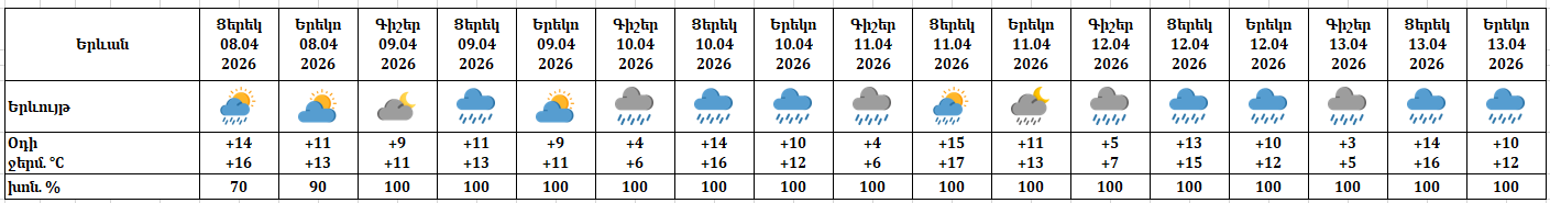 Ապրիլի 8-ի ցերեկը հնարավոր է կարճատև անձրև։ Ապրիլի 9-13-ին ժամանակ առ ժամանակ սպասվում է անձրև, հնարավոր է նաև ամպրոպ։ Ապրիլի 9-10-ին սպասվում է քամու ուժգնացում 14-18մ/վ արագությամբ։