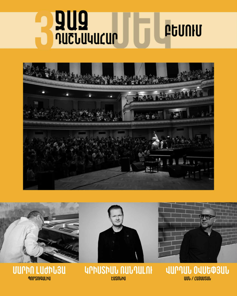 Դաշնակահարներ Վարդան Օվսեփյանը (ԱՄՆ/Հայաստան), Մարիո Լաժինյան (Պորտուգալիա), Կրիստիան Ռանդալուն (Էստոնիա) մայիսի 17-ին «Արամ Խաչատրյան» համերգասրահում կկատարեն ականավոր կոմպոզիտորների գործեր՝ ջազային մեկնաբանությամբ։