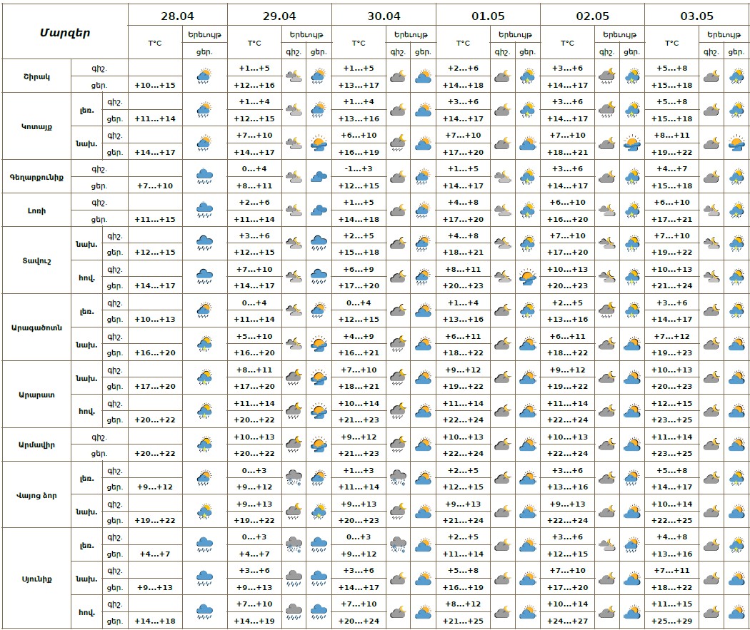 Ապրիլի 28-ի ցերեկը, 29-30-ին, մայիսի 1-3-ին առանձին շրջաններում սպասվում է կարճատև անձրև և ամպրոպ, տեղ-տեղ հնարավոր է կարկուտ: Ապրիլի 29-ի գիշերը լենային շրջաններում տեղումները կլինեն թաց ձյան տեսքով։ Քամին`հարավարևմտյան`2-5 մ/վ, ամպրոպի ժամանակ սպասվում է նաև քամու ուժգնացում 16-20 մ/վ արագությամբ։